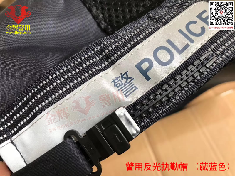材料:3M反光邊,防水尼龍麵料,內裏棉,銀絲線刺繡警徽(huī),熱成型防變形帽簷。