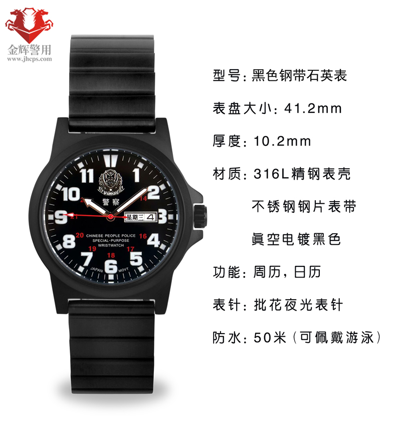 外殼(ké)采用優質不鏽鋼表殼,電鍍黑色(sè)。優(yōu)質不鏽鋼表帶(包(bāo)邊(biān)帶(dài)),電鍍(dù)黑色。日本進口雙日曆石英機芯有星期,日期功能,原裝進口電池(chí)走時2-3年,表盤1-12數字和表針有夜光功能,(夜晚如(rú)夜光不強烈,可貼(tiē)近燈管照射,以此方法吸光效果會更加強烈。)不鏽(xiù)鋼底蓋,50米防水(shuǐ),保修一年。