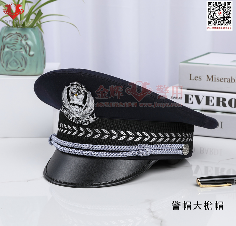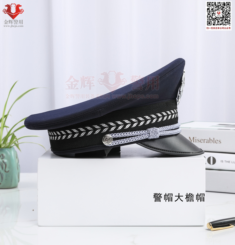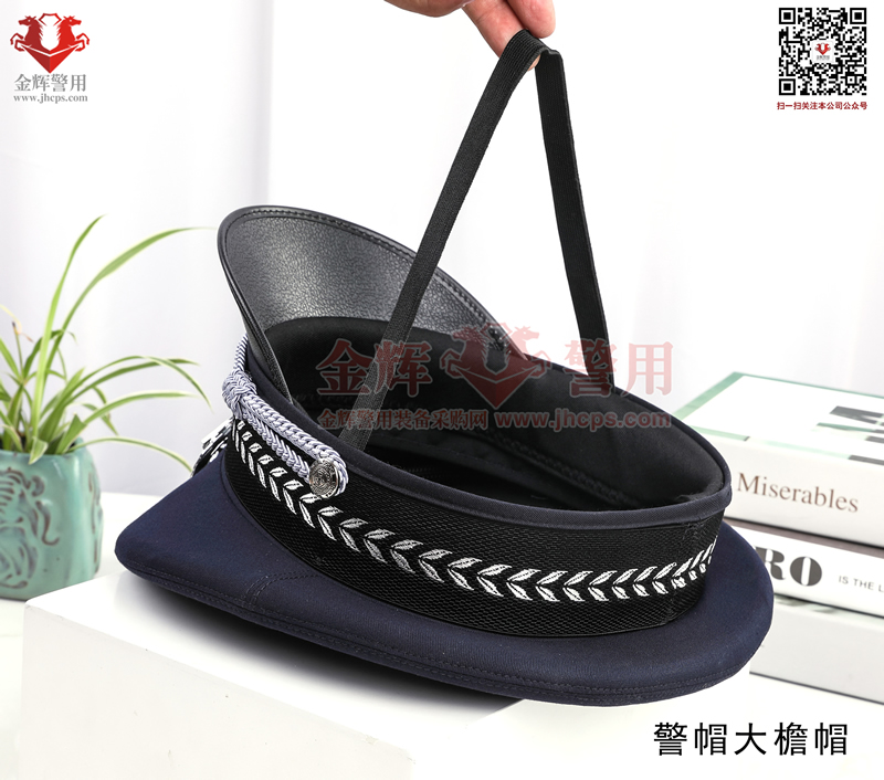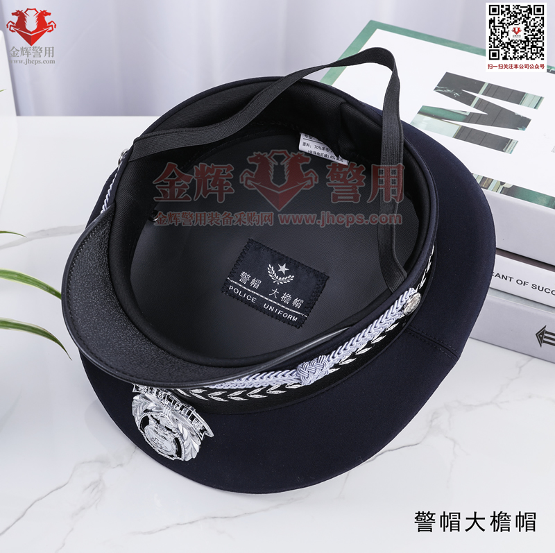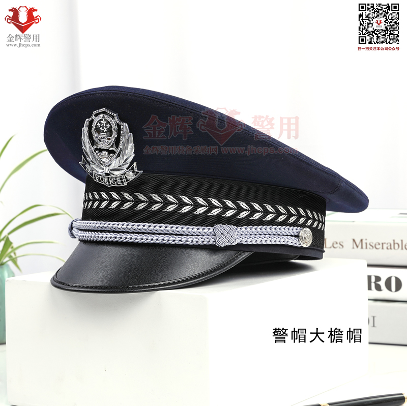 警用大簷帽是每警必備的一款彰顯我國警察(chá)的標配物品,警(jǐng)用大簷帽技(jì)術參數:麵料70%羊毛,26%滌綸(含導電纖(xiān)維)4%氨綸,產(chǎn)品為藏(cáng)青色(藏藍色)。定型美(měi)觀,佩戴莊嚴。同時(shí)可選白色交警款,夏季款。
