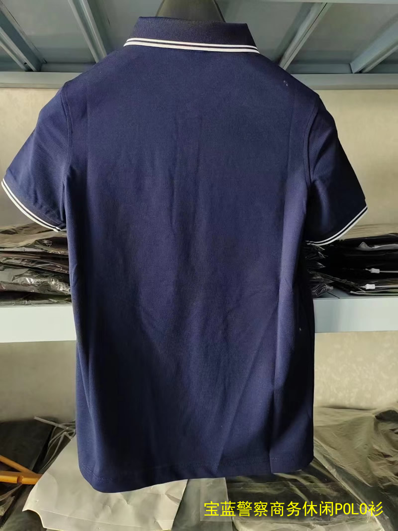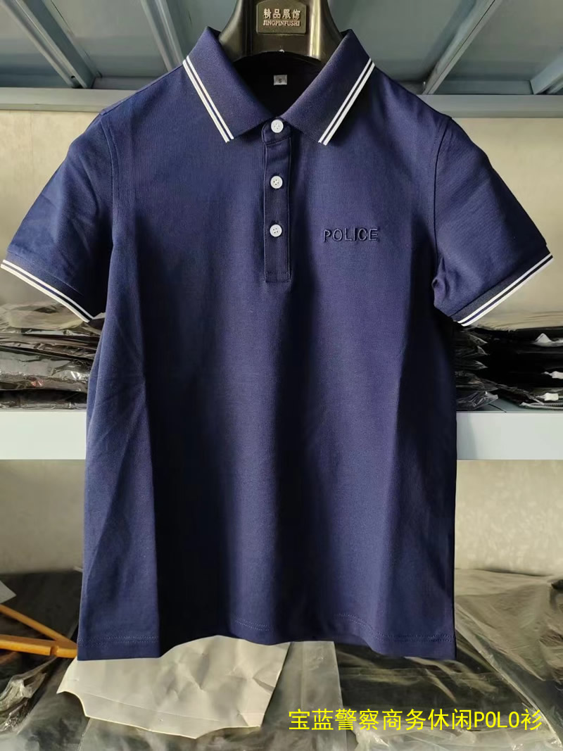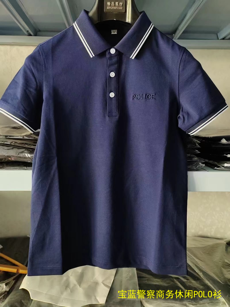 警務翻(fān)領文化POLO衫,麵料含60%棉,40%桑蠶絲(sī),寶藍色,精致刺繡警察POLICE字母。商務,休閑,工作三不誤。