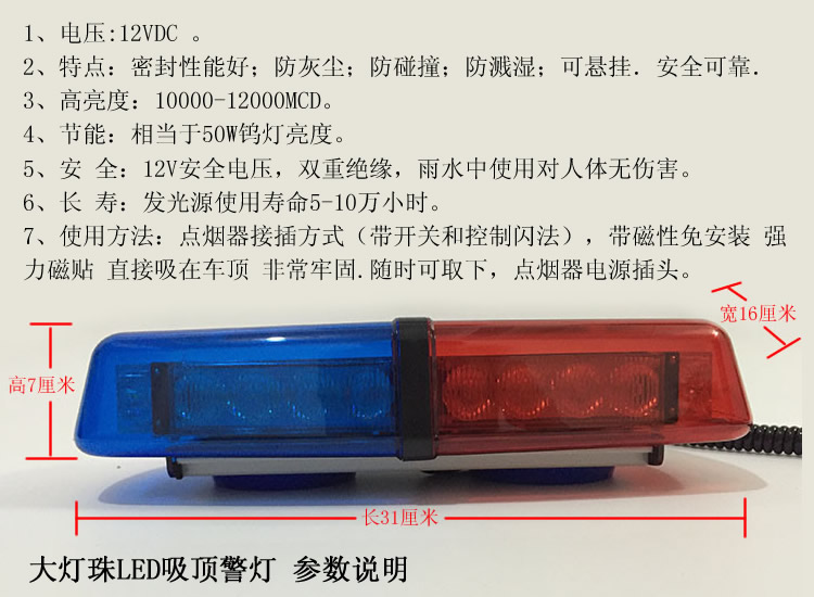 1、電壓:12VDC 。 2、特點:密封性能好(hǎo);防灰塵;防碰撞;防濺濕;可(kě)懸掛.安全(quán)可靠. 3、高亮度:10000-12000MCD。 4、節(jiē)能:相當於50W鎢燈亮度。 5、安 全:12V安全電(diàn)壓,雙重絕緣,雨水中使用對人體無傷害。 6、長(zhǎng) 壽:發光源使用壽命5-10萬小時(shí)。 7、使用方法:點(diǎn)煙器接插(chā)方式(帶開關(guān)和控製閃法),帶磁性免安(ān)裝 強力磁貼 直接吸(xī)在車頂 非常(cháng)牢固.隨時可取下(xià),點煙器電源插頭。