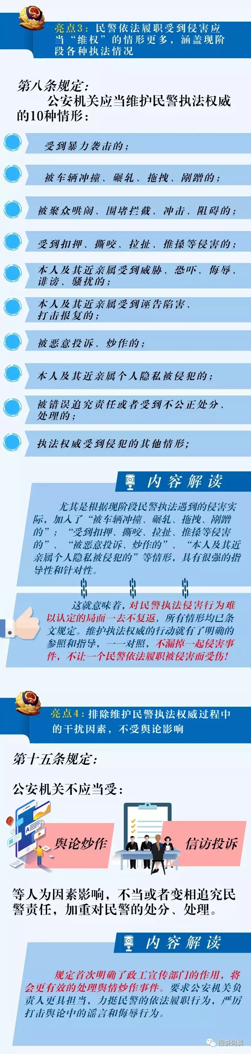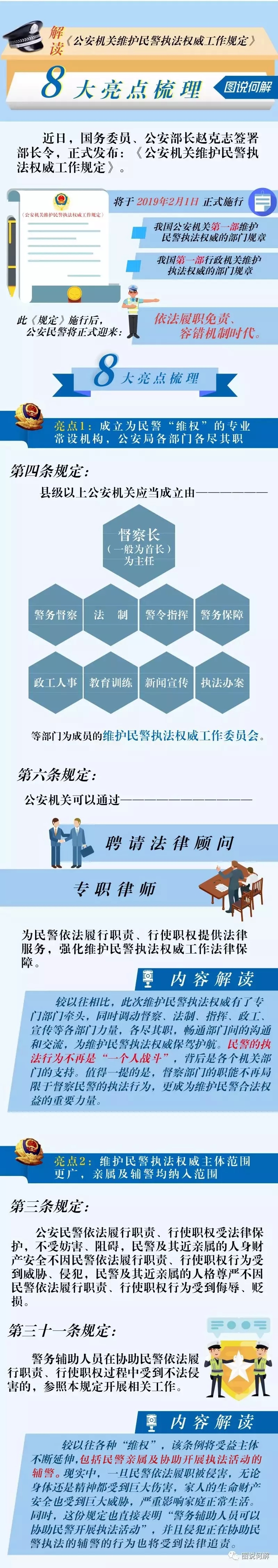 《規定》明(míng)確(què):一是成立為民警“維權”的專業常設機構,公安機關各部門(mén)各盡(jìn)其職;二是維護(hù)民(mín)警(jǐng)執法權(quán)威(wēi)主體範圍(wéi)更廣,親屬及輔警均納入範圍;三是(shì)民警依法履職受到侵害應當(dāng)“維權”的情(qíng)形更多,涵(hán)蓋現階段各(gè)種(zhǒng)執法(fǎ)情(qíng)況;四是排除維(wéi)護民警執法權威過程中的幹擾因素,不受輿論影響;五是明確規定救濟措施(shī)及醫療衛(wèi)生保障,為民警提供物質幫助;六是明確依法履職造成(chéng)損失的民警不用擔責,由公安機關給予(yǔ)相應補償;七是嚴厲查處維護民警(jǐng)執法權威中的不作為和亂作(zuò)為,追(zhuī)究領導和責任人責任;八(bā)是建立完(wán)善(shàn)的對外發布機(jī)製,強化普法(fǎ)工作。