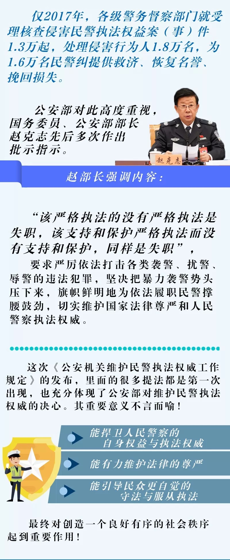為保(bǎo)障公(gōng)安民警依法履(lǚ)行職責、行使職權,維護國家(jiā)法律尊嚴和民警執法權威,在深入調查研究和廣泛征求意見基礎上,公(gōng)安部製定了《公(gōng)安機關維護(hù)民警執法權威工作規定》,經國務委員、公安部部(bù)長趙克誌簽署部長令發布,將於2019年2月1日起正式施行。這是我國首部維護公安民(mín)警執法(fǎ)權威的部門規(guī)章(zhāng)。