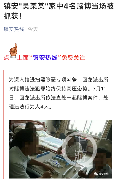 據鎮安當地媒體發布的(de)稿件稱,7月(yuè)11日,鎮安縣公(gōng)安(ān)局回(huí)龍派出所(suǒ)接到群眾舉報稱,和坪村吳某某家中有人賭博。接(jiē)到舉報後(hòu),民警立即趕(gǎn)到現場,當場抓獲吳某某等涉(shè)賭人員4名,查獲賭資270元及賭具麻(má)將一副。經(jīng)審訊,四人對違法行為供認不(bú)諱。回龍派出(chū)所根據(jù)《治安管理處罰法》對4名(míng)涉賭人員給予沒收賭資賭(dǔ)具並每人罰款100元的處罰。