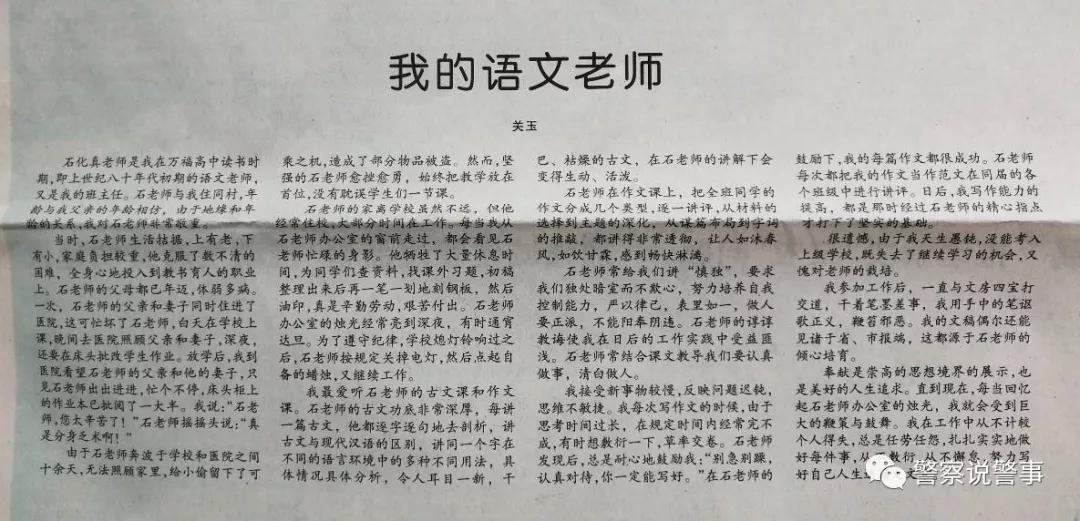 “正式”成為公安機關的一名(míng)工作人員,讓關玉受到很(hěn)大的鼓舞,在這其間關玉發揮(huī)自己的寫作特長,開始向(xiàng)各報刊(kān)雜誌投稿。從1993年到1997年(nián)其(qí)間,他累計被《蓋州市報》、《營口公安(ān)報》、《營口日報(bào)》、《遼寧公安(ān)報》、《遼寧日報》等(děng)報刊雜誌采稿(gǎo)120餘(yú)篇次。“《遼寧日報》和《遼寧公(gōng)安報》給的稿費最多,同樣篇幅的文(wén)章,《營(yíng)口日報》給5元錢,《遼寧日報》能給20元錢稿費”關玉笑著說。“之(zhī)前我頭發可密了,就是那時候總熬夜熬的(de)。白天工(gōng)作忙,就晚上寫稿,一寫就寫到後半夜。”