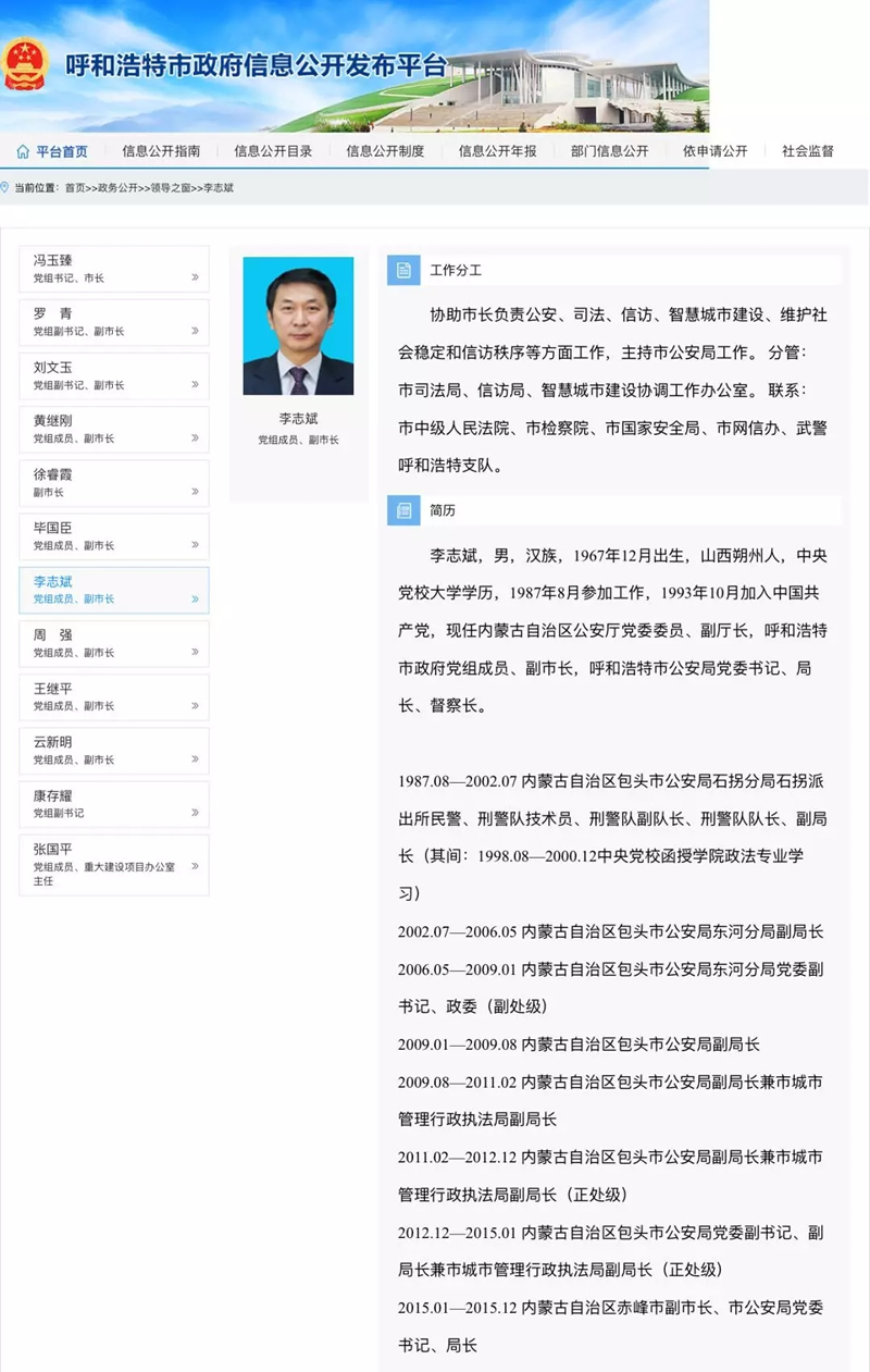另據新華社消息 ,內蒙古自治區公安廳原副廳長、呼和(hé)浩特市副市長(zhǎng)、呼(hū)和浩特市公安局局長李誌斌於2018年11月1日自殺身亡。