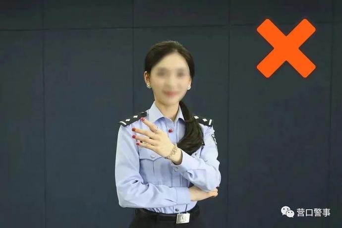 錯誤:著警服時戴耳環、耳釘、項鏈、戒指、腕飾等;穿耳洞(女性民警(jǐng)除外)、鼻洞、唇洞,留長發的女性(xìng)民警著裝時發辮過肩。