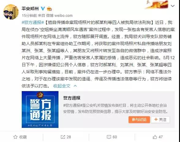 #警方通報#【擅自傳(chuán)播命案現場照(zhào)片的郝某利等四人被我局依(yī)法刑拘】近日,我(wǒ)局在偵辦“空姐(jiě)乘坐滴滴順風車遇害”案件過程中,發現一(yī)張包含有受害人信息的案件現場照片在網絡上(shàng)流傳,警方隨即展開調查(chá)。經查,我局警犬訓導支隊警務輔助人員郝某利在專案(àn)組協助(zhù)工作期間,將獲取(qǔ)的案件現場照片私自傳(chuán)播給朋(péng)友劉某洲(zhōu)、張某、張某超等人,其朋友又將照片轉發至各自的(de)微信群中(zhōng),造成涉案照片在網(wǎng)絡上大量傳播,嚴重傷害受害人家屬的感情,造成惡劣的社會影響。