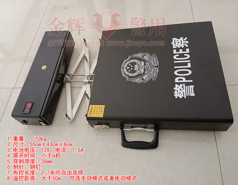 1.重量:<10kg 2.尺寸:55cm×43cm×8cm 3.電池電壓:12V,電(diàn)流:1.5A 4.展(zhǎn)開時間:小(xiǎo)於6秒 5.穿(chuān)刺厚度:35mm 6.刺(cì)針:鋼釘 7.布控長(zhǎng)度:2-7米內自由選擇 8.遙控距離:大於50m 9.可選手動模式(shì)或者電動模式