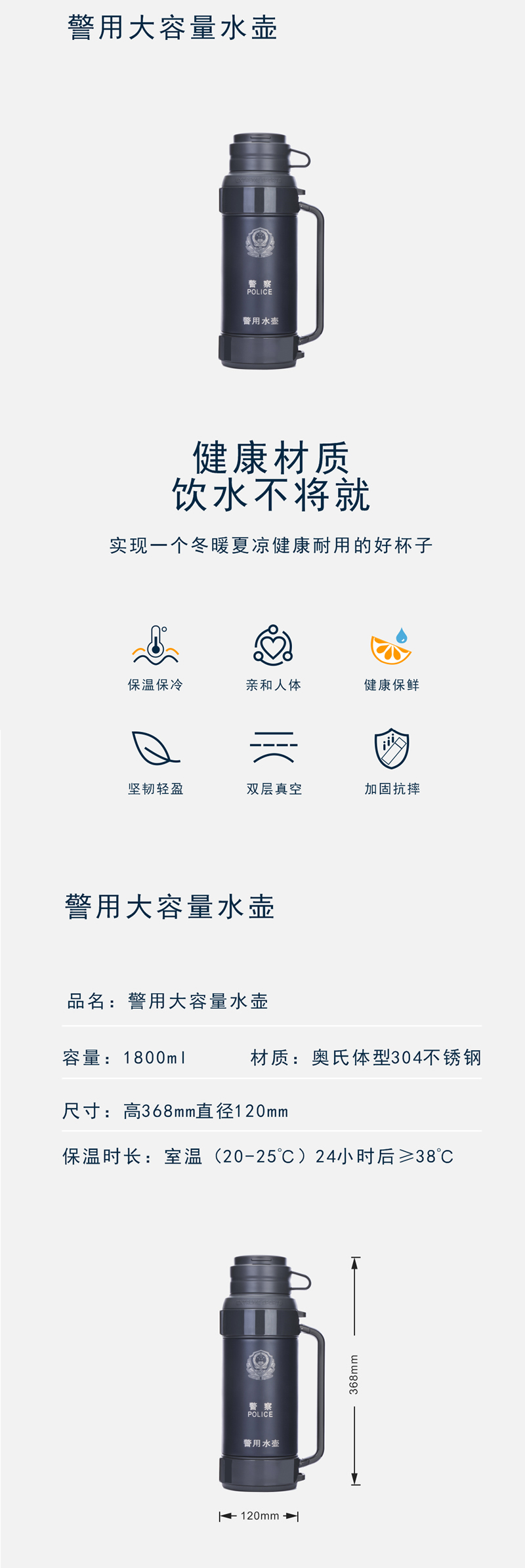 警用不鏽鋼保溫壺,公安(ān)部入圍(wéi)產品,全國品質口碑最好的的警用保溫水壺企業出品(pǐn)。可選1.5和1.8升容量。