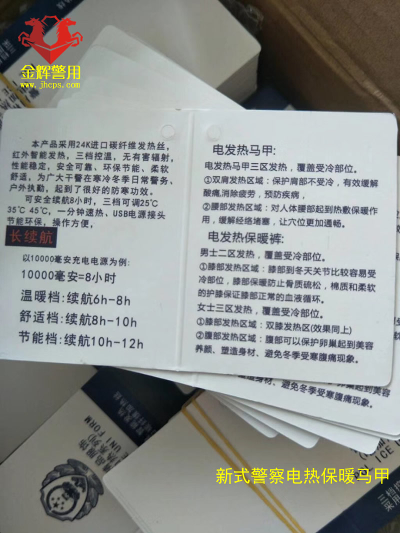 警察新款警用智能(néng)加熱保暖馬甲采用v領設計,不論是外穿還是內(nèi)穿都能很好(hǎo)的鎖住美觀,胸貼為粘貼(tiē)式,可選擇警察或特警(jǐng)字樣胸貼,可根據不同身材搭配不同型號電(diàn)熱馬甲。本款保暖馬甲具備了修身保暖(nuǎn)不浮腫,加(jiā)熱方(fāng)式(shì)采(cǎi)用紅外線,安全節能 ,續熱時長8-10小時。