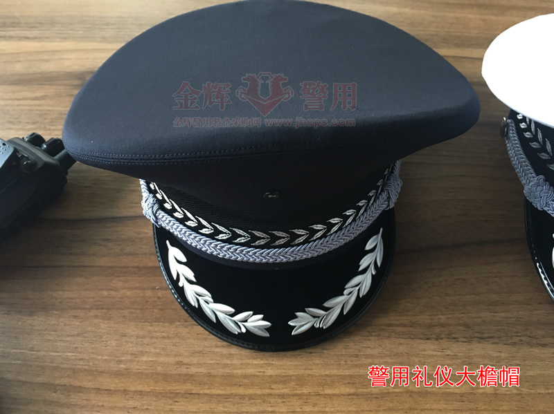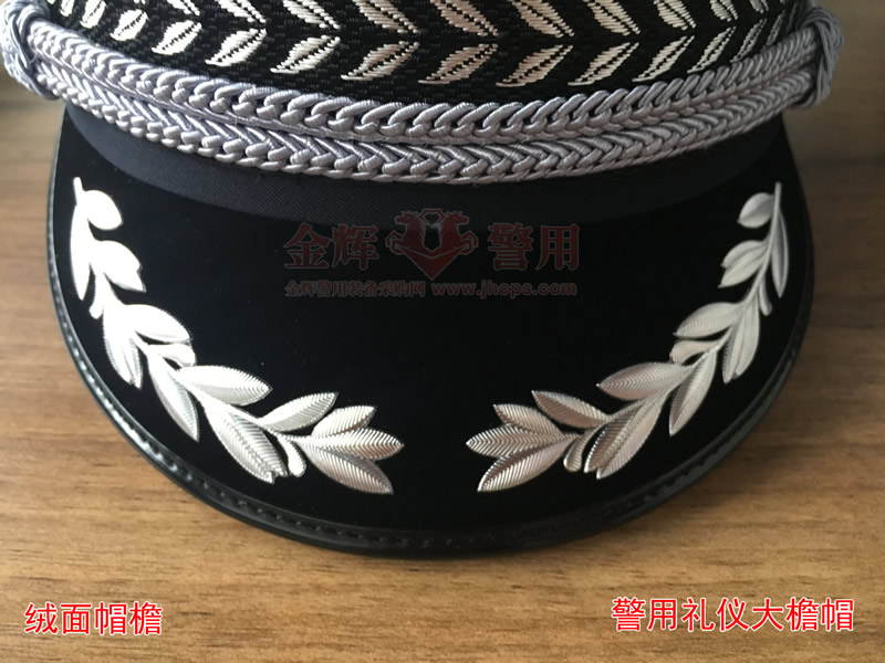 新款警察禮儀大簷帽是在99式警察大簷帽的基礎上改(gǎi)良,其中最明顯的地方是絨麵帽簷(yán)添加了橄欖枝,橄欖枝象征和平和莊嚴的警察形象。新款警察(chá)禮儀大簷帽藏藍色款式和白色款式,按頭圍配發。