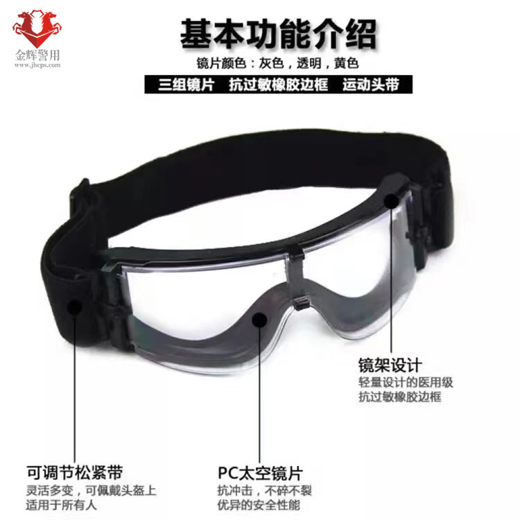 新型特警護(hù)目鏡主要是用於保護警務人員外出突發事件時對眼鏡的保護,鏡片采用德(dé)國拜耳PC片,防劃聚碳(tàn)酸酯材料,流線型設計,視野(yě)清晰,舒適透氣,有(yǒu)效(xiào)抵抗風沙,防護性強.本中心所供(gòng)護目鏡,完全依據公安(ān)部警用(yòng)裝備配備標準加工並銷售,新式護目鏡配置3種不同顏色鏡片,可以自由切換。
